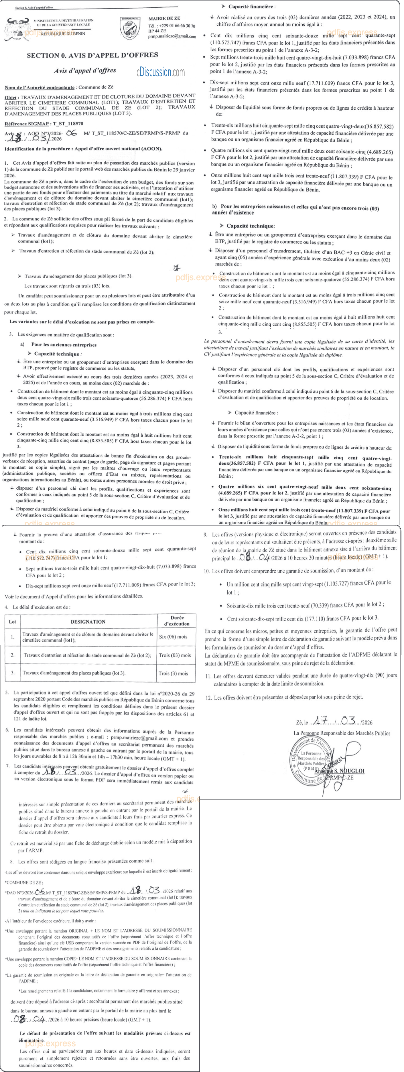 AVIS D'APPEL D'OFFRES: TRAVAUX D'AMENAGEMENT ET DE CLOTURE DU DOMAINE DEVANT ABRITER LE CIMETIERE COMMUNAL(LOTI); TRAVAUX D'ENTRETIEN ET REFECTION DU STADE COMMUNAL DE ZE(LOT 2); TRAVAUX D'AMENAGEMENT DES PLACES PUBLIQUES(LOT 3)