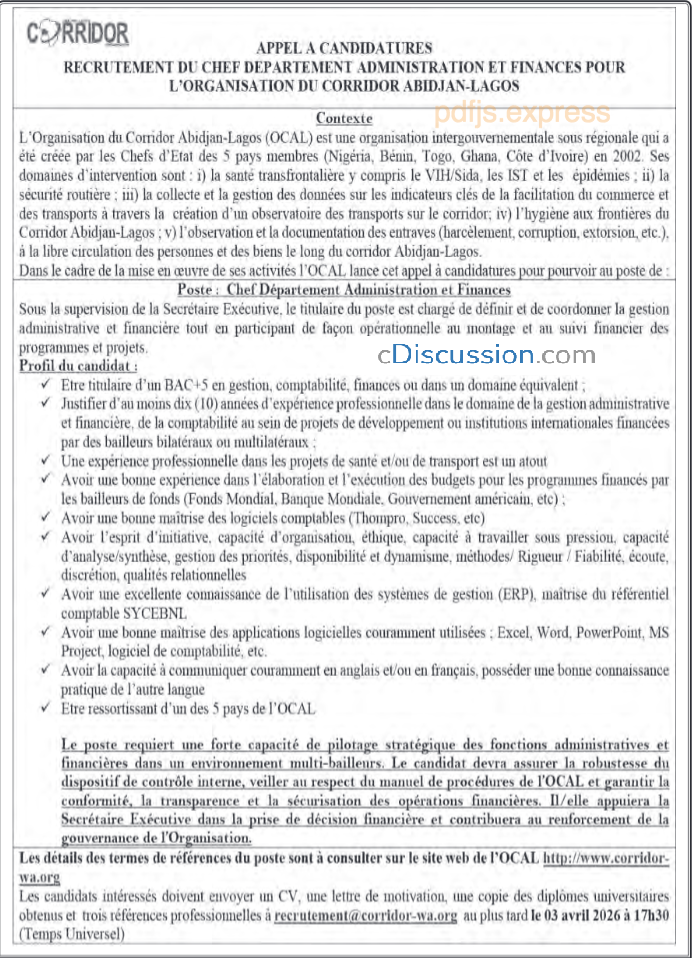 APPEL A CANDIDATURES : RECRUTEMENT DU CHEF DEPARTEMENT ADMINISTRATION ET FINANCES POUR L'ORGANISATION DU CORRIDOR ABIDJAN-LAGOS
