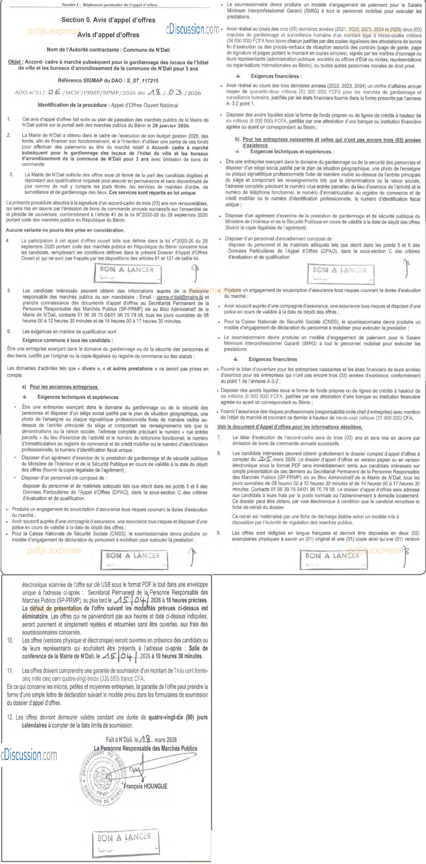 ACCORD-CADRE A MARCHE SUBSEQUENT POUR LE GARDIENNAGE DES LOCAUX DE L'HOTEL DE VILLE ET LES BUREAUX D'ARRONDISSEENT DE LA COMMUNE DE N'DALI POUR 3 ANS