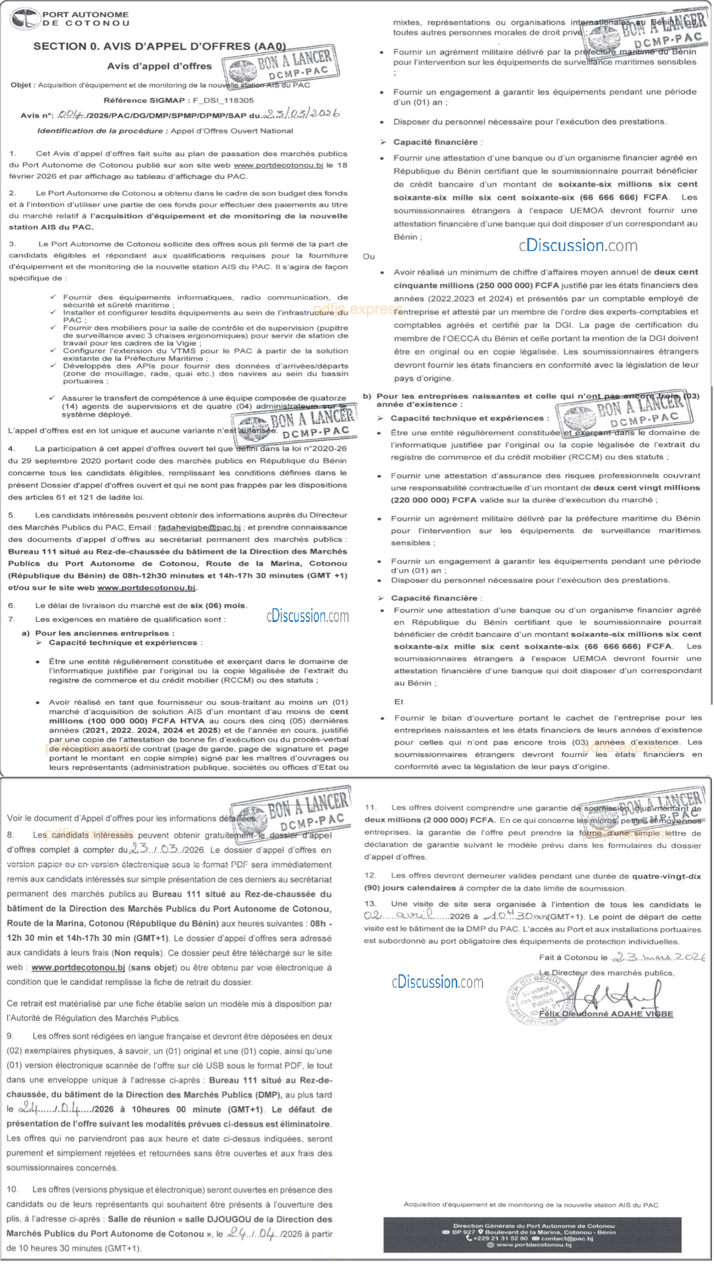 AVIS D'APPEL D'OFFRES(AAO) RELATIF L'ACQUISITION D'EQUIPEMENT ET DE MONITORING DE LA NOUVELLE STATION AIS DU PAC