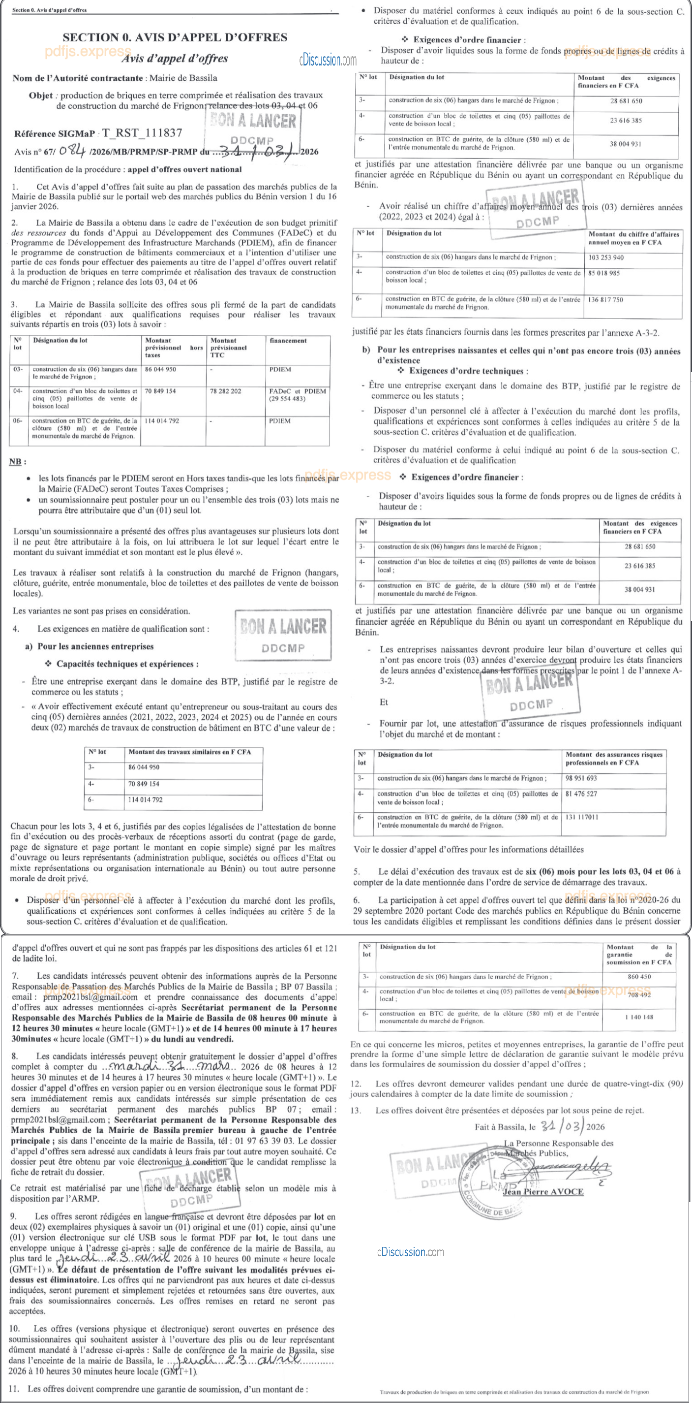 PRODUCTION DE BRIQUES EN TERRE COMPRIMEE ET REALISATION DES TRAVAUX DE CONSTRUCTION DU MARCHE DE FRIGNON: RELANCE DES LOTS 03, 04 ET 06