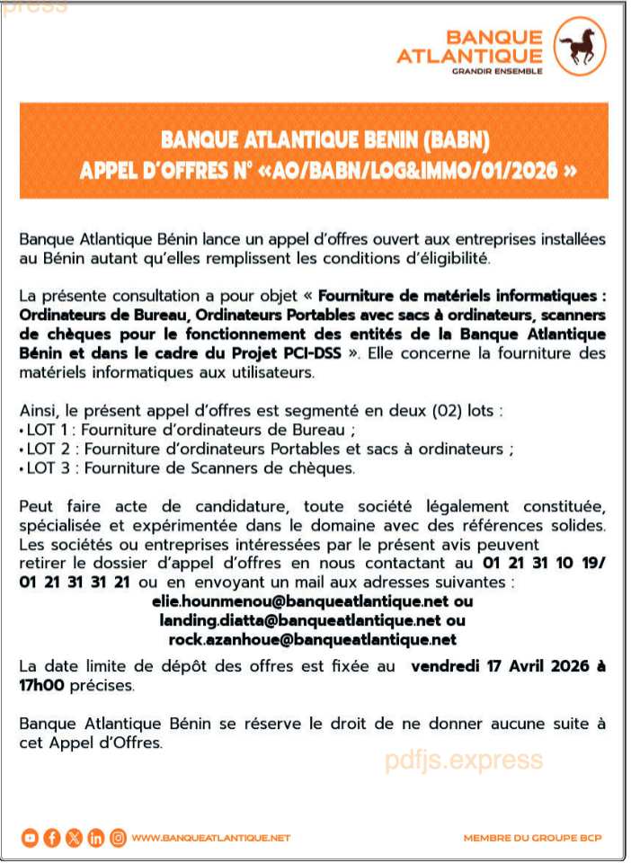 FOURNITURE DE MATERIELS INFORMATIQUES: ORDINATEURS DE BUREAU, ORDINATEURS PORTABLES AVEC SACS A ORDINATEURS, SCANNERS DE CHEQUES POUR LE FONCTIONNEMENT DES ENTITES DE LA BANQUE ATLANTIQUE BENIN ET DANS LE CADRE DU PROJET PCI-DSS
